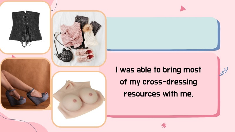 When moving from my hometown to where I Study, I was able to bring most of my cross-dressing resources with me. It includes a bag full of female clothes, some shapewear, shoes, some of my wigs, makeup supplies, and a box with my roanyer silicone breast forms. But since I share the apartment, I can’t just leave it anywhere. Because of that, I keep my makeup in a cardboard box inside of my closet, near the box with my silicone breastplate. My wigs are gently stored in their original package as well and share a drawer with my shapewear. My clothes, on the other hand, my clothes are still in my backpack, alongside my hosiery and feminine underwear. And that’s due to two main reasons. First, I don’t have enough hangers, and since I share my closet, the space is limited. And second, it’s still something intimate to me, and I don’t want my housemates to see that stuff so often.