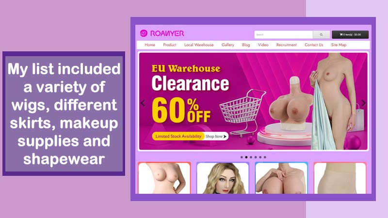 During high school, I learned a lot more about crossdressing and gender identity. I used my free time to watch videos on the subject, and learn new skills. I made a list of stuff I wanted to buy, but I wasn’t making any money by myself, so I knew I had to wait. I don’t know how, but I managed to be quite patient. My list included a variety of wigs, different skirts, makeup supplies and shapewear. It also included bodysuits and breast forms, since I had already heard of Roanyer and this kind of thing.
