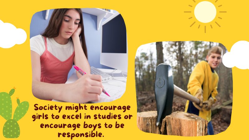 For instance, society might encourage girls to excel in studies or encourage boys to be responsible.