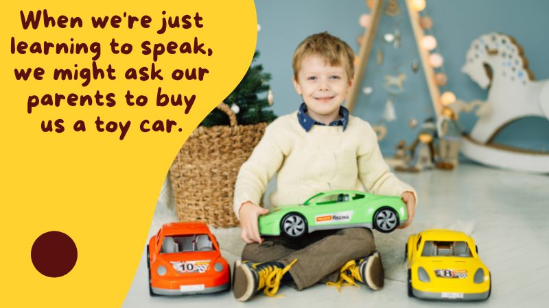 For example, when we’re just learning to speak, we might ask our parents to buy us a toy car.
