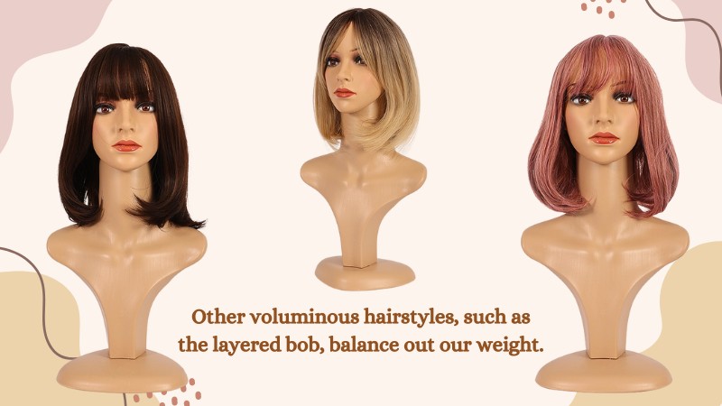 It is an easy, neat, and top knot style for running errands with our silicone pregnant belly. Other voluminous hairstyles, such as the layered bob, balance out our weight.