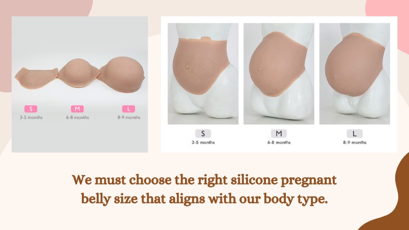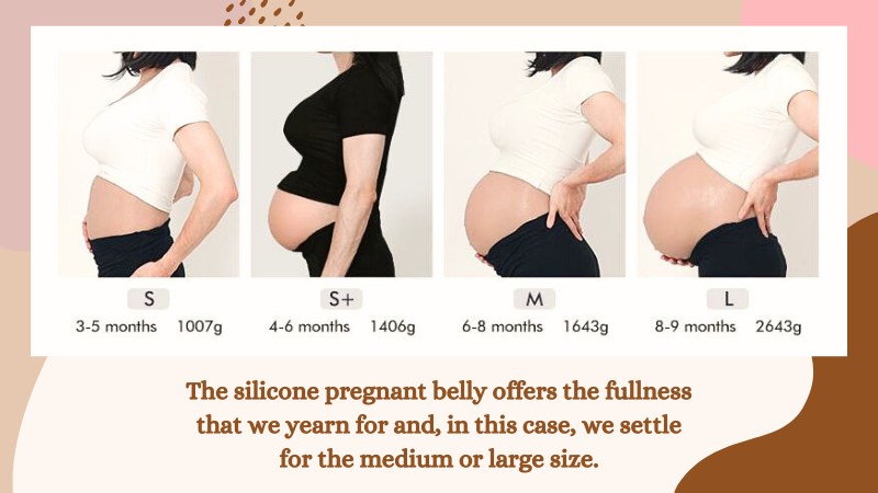 We must choose the right silicone pregnant belly size that aligns with our body type. For instance, the sizes range from a variety of months. This includes the medium (3-4 months), large (5-6 months), XL (7-8 months), and XXL (9-10 months).