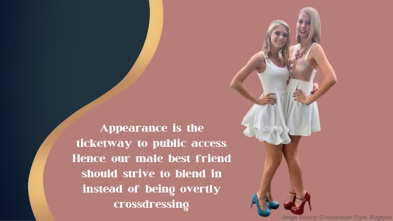 Appearance is the ticketway to public access. Hence, our male best friend should strive to blend in instead of being overtly crossdressing.