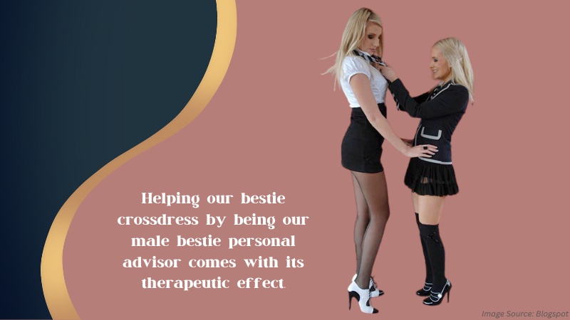 Helping our bestie crossdress by being our male bestie’s personal advisor comes with its therapeutic effect. Our male bestie needs to know that we are there to help them get up when the going gets tough. It is us and our male bestie against the world as our perfect crossdressing duo!