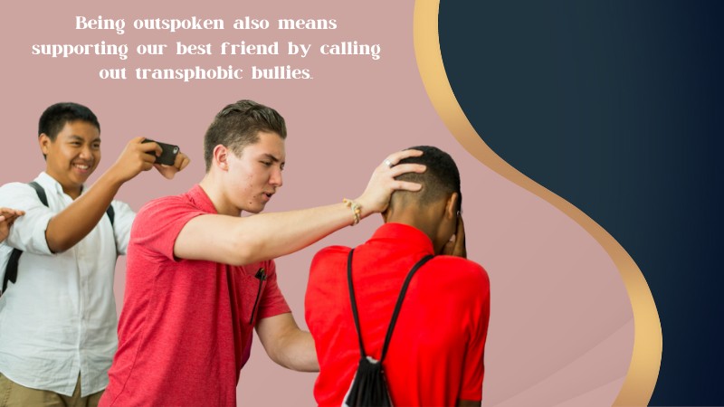 Being outspoken also means supporting our best friend by calling out Transphobic bullies. This includes making complaints to people in authority regarding Trans bullying.