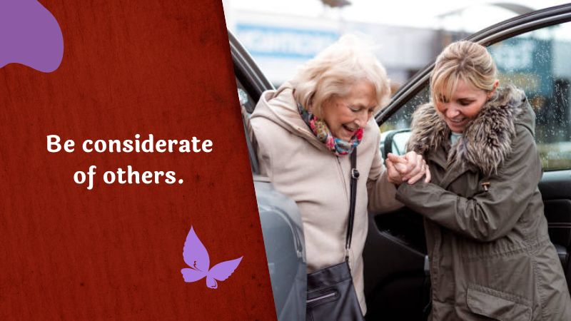 Be considerate of others. This means holding doors open for people, giving up your seat on the bus or train for someone who needs it more than you do, etc.