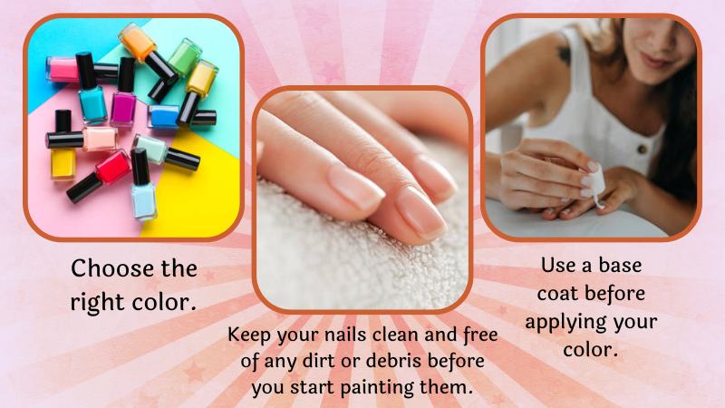 - Keep your nails clean and free of any dirt or debris before you start painting them. This will help the polish go on smoother and prevent any streaks or unevenness.