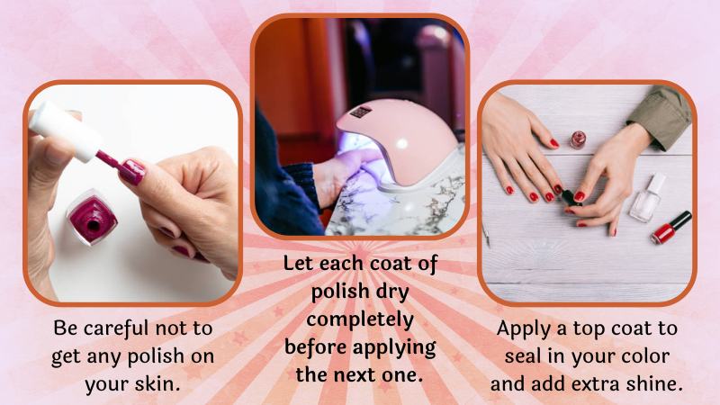 - Let each coat of polish dry completely before applying the next one. This will prevent any smudging or streaking.