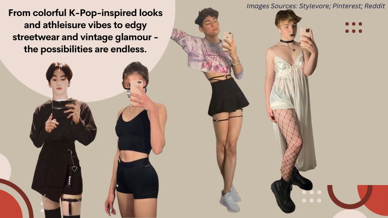 From colorful K-Pop-inspired looks and athleisure vibes to edgy streetwear and vintage glamour – the possibilities are endless.