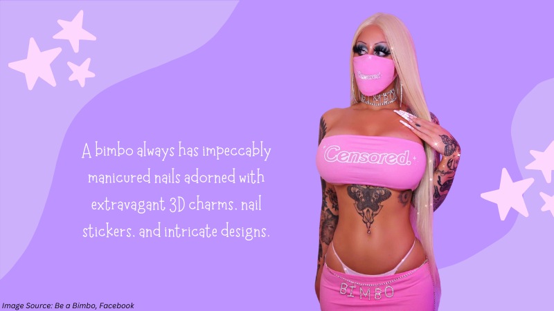 A bimbo always has impeccably manicured nails adorned with extravagant 3D charms, nail stickers, and intricate designs.