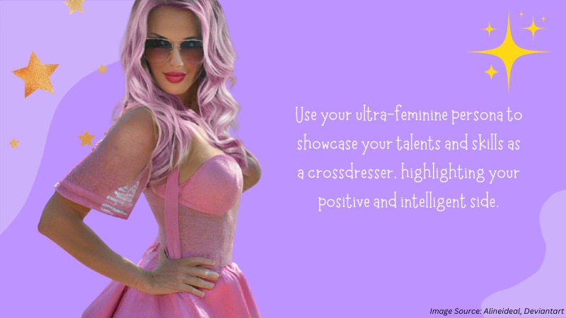 Use your ultra-feminine persona to showcase your talents and skills as a crossdresser, highlighting your positive and intelligent side.
