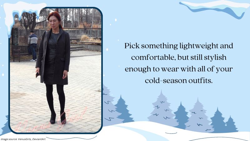 Layer well! A thick sweater under a blazer is probably too much, but wearing a fitted black turtleneck under a crisp white button-down makes for an elegant transition into the evening. The key is layers—layers of soft fabrics in pastels, prints, and florals that will help you maintain your standards while keeping warm at the same time. You can’t go wrong with a combination of long-sleeve tops paired with tights and knee-high boots. Keep it simple! A little black dress with black tights and boots will give you an instant glam look that works anywhere from an office party to a holiday dinner with friends at home. Just make sure everything fits well and coordinates with each other—this is key! Also, remember that a scarf and hat can go a long way toward making any outfit look more feminine.