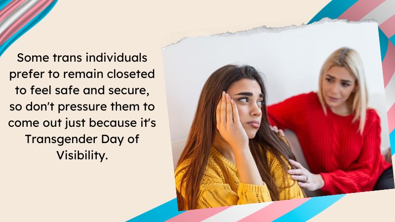 Don’t out your trans friends. Some trans individuals prefer to remain closeted to feel safe and secure, so don’t pressure them to come out just because it’s Transgender Day of Visibility. The decision to come out as transgender is a significant one for any trans person and should be theirs alone.