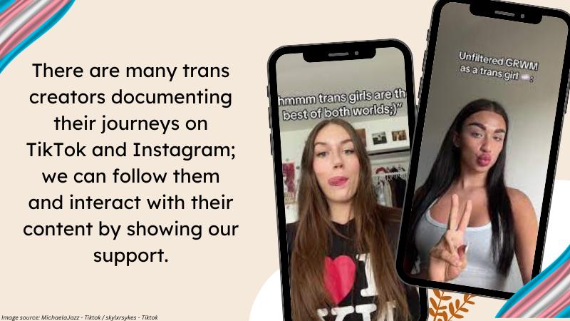 There are many trans creators documenting their journeys on TikTok and Instagram; we can follow them and interact with their content by showing our support.