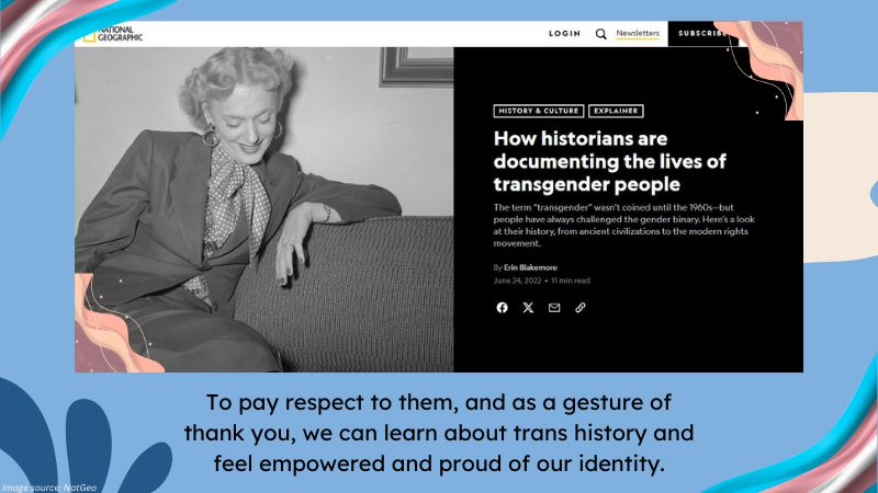 To pay respect to them, and as a gesture of thank you, we can learn about trans history and feel empowered and proud of our identity.