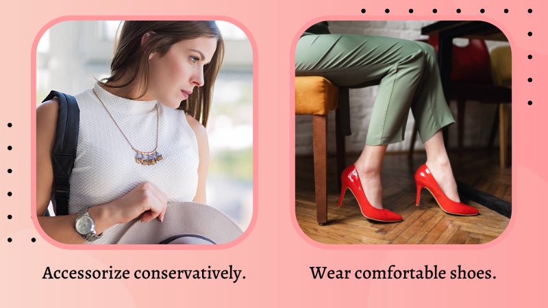 - Wear comfortable shoes. You’ll be doing a lot of walking in business casual attire, so make sure your shoes are comfortable. Avoiding heels if possible.