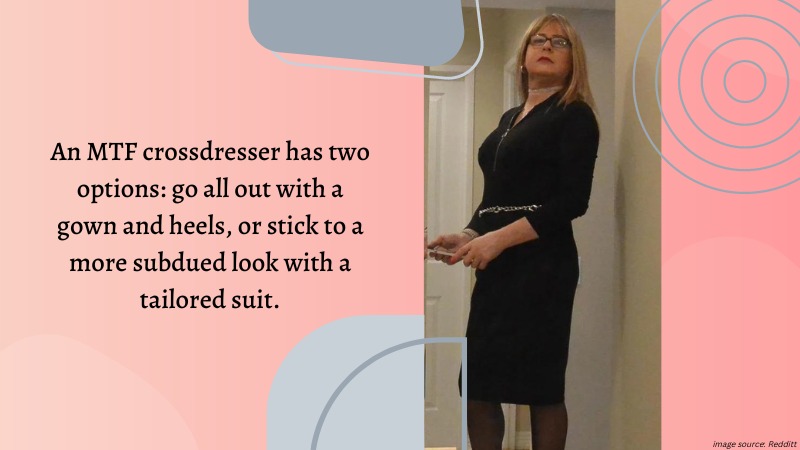 When it comes to formal wear for a black-tie event, an MTF crossdresser has two options: go all out with a gown and heels, or stick to a more subdued look with a tailored suit.