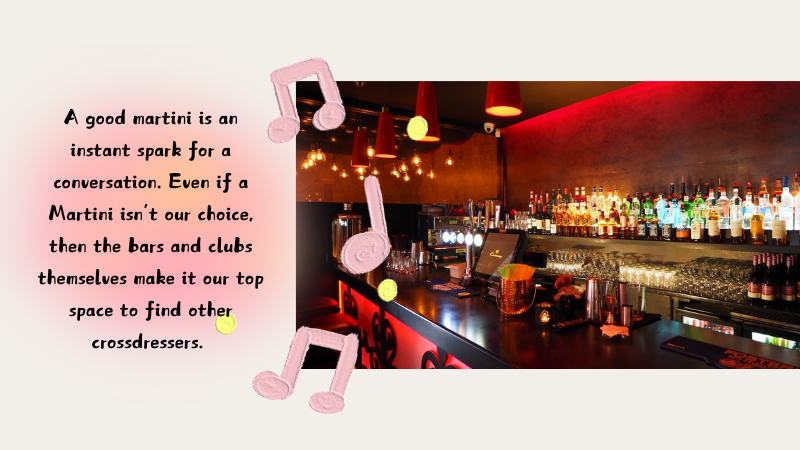 A good martini is an instant spark for a conversation. Even if a Martini isn’t our choice, then the bars and clubs themselves make it our top space to find other crossdressers.