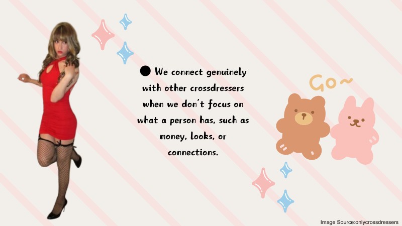 - Avoid superficial connections such as excessive focus on appearances. We connect genuinely with other crossdressers when we don’t focus on what a person has, such as money, looks, or connections.