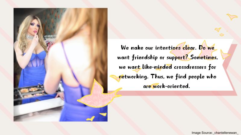 We make our intentions clear. Do we want friendship or support? Sometimes, we want like-minded crossdressers for networking. Thus, we find people who are work-oriented.
