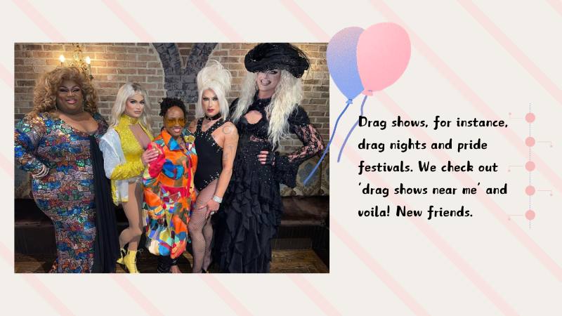 Drag shows, for instance, drag nights and pride festivals. We check out ‘drag shows near me’ and voila! New friends.