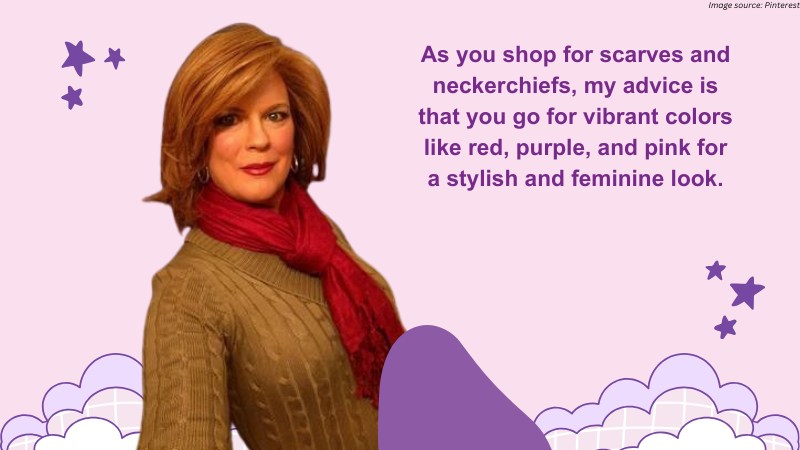 As you shop for scarves and neckerchiefs, my advice is that you go for vibrant colors like red, purple, and pink for a stylish and feminine look.