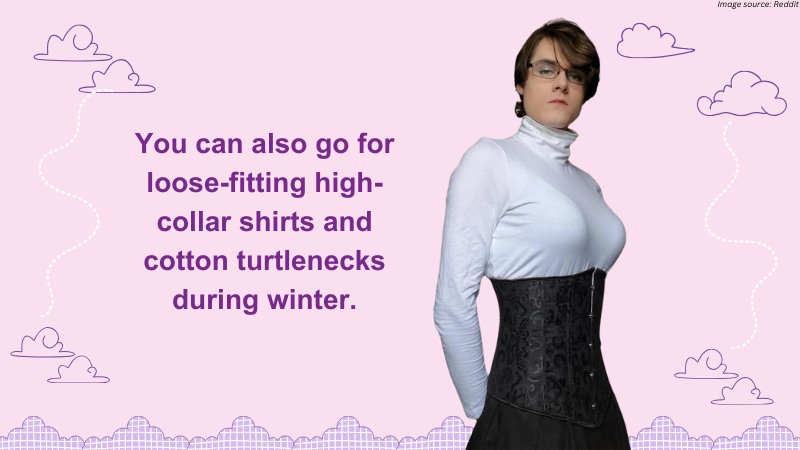 You can also go for loose-fitting high-collar shirts and cotton turtlenecks during winter.