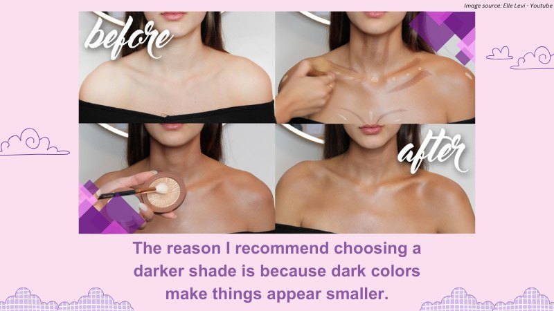 - Start by choosing a contouring powder or cream that is two shades darker than your neck.