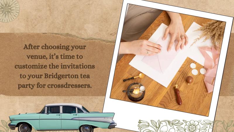After choosing your venue, it’s time to customize the invitations to your Bridgerton tea party for crossdressers.