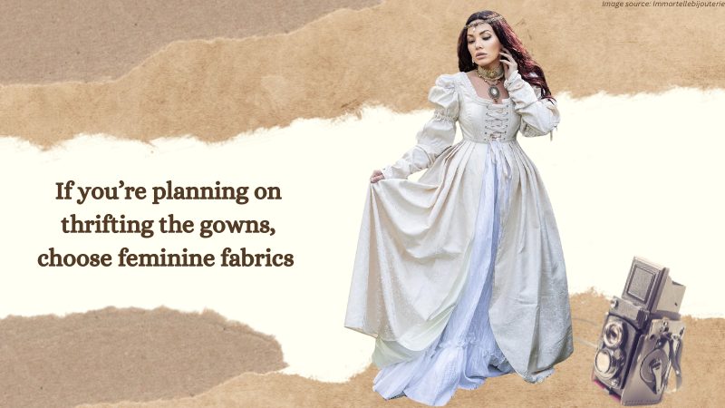 If you’re planning on thrifting the gowns, choose feminine fabrics such as: