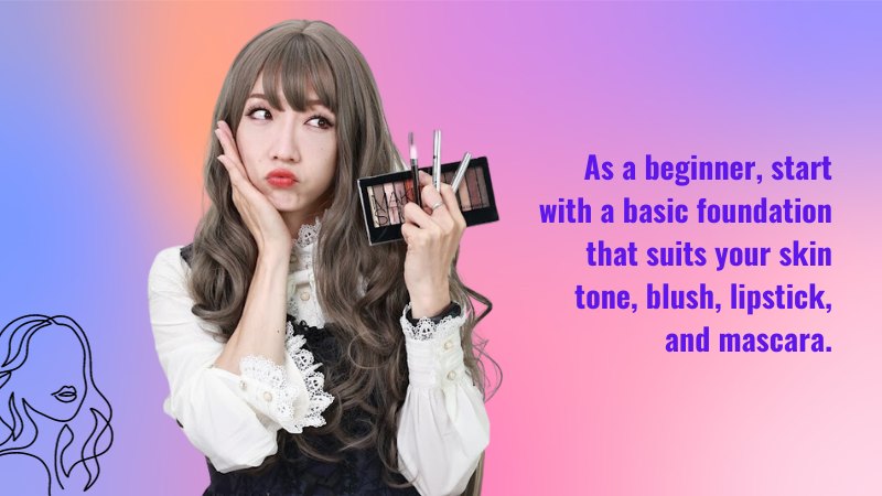 As a beginner, start with a basic foundation that suits your skin tone, blush, lipstick, and mascara.