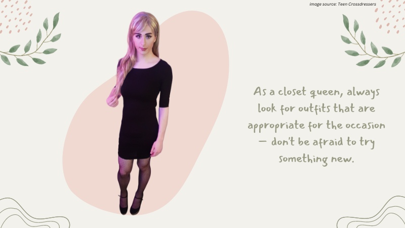 As a closet queen, always look for outfits that are appropriate for the occasion – don’t be afraid to try something new. However, make sure it’s modest enough not to draw too much attention to your gender.
