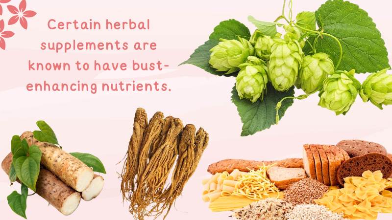 Certain herbal supplements are known to have bust-enhancing nutrients. These are wild yam, saw palmetto, grains, chaste-tree berries, hops, and dong quai.