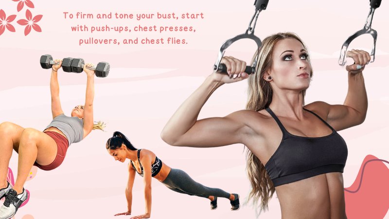 To firm and tone your bust, start with push-ups, chest presses, pullovers, and chest flies. Working out your pectoral muscles will definitely help improve the shape of the breast.