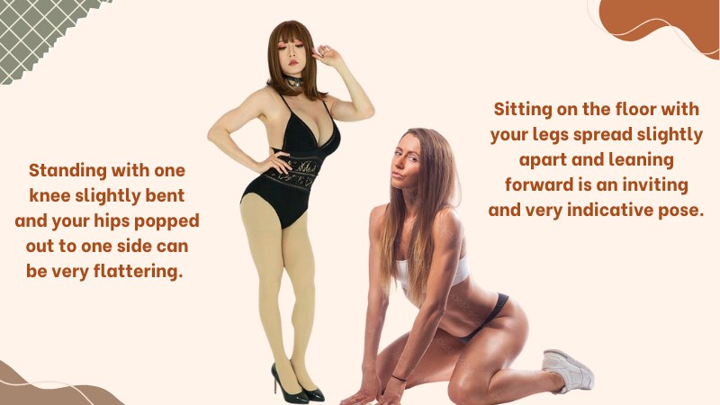 - Sitting on the floor with your legs spread slightly apart and leaning forward is an inviting and very indicative pose. This one’s best to show off your legs and adds a touch of playful charm.