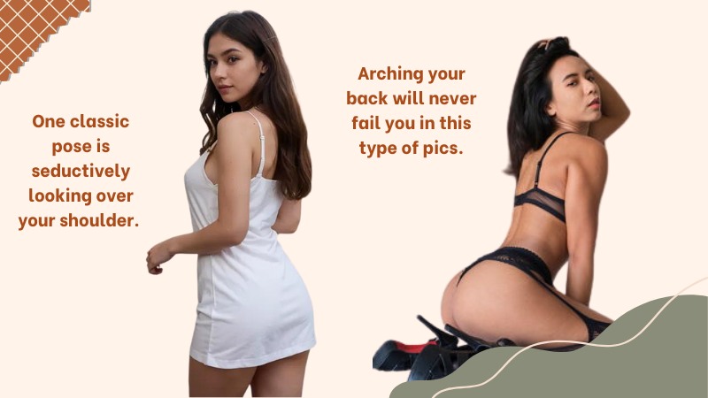 - One classic pose is seductively looking over your shoulder. It’s easy, straightforward, and highlights your sexy shoulder. Just glance back, maybe pool your hair over the other side, and smile seductively. Or innocently (but your audience knows exactly what that smile tells). Directly look at the camera and make it sizzle!