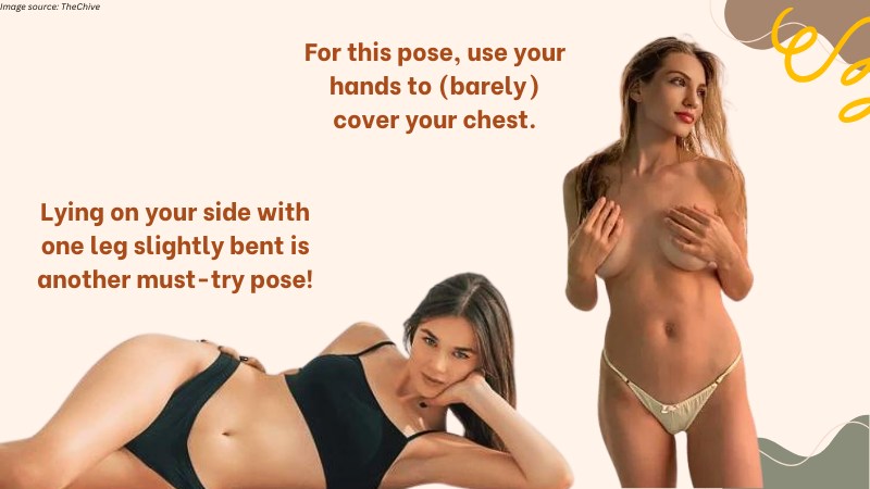 - Lying on your side with one leg slightly bent is another must-try pose! This pose emphasizes your curves, too, and can be very suggestive. It’s an intimate pose you’ll only let your lovers (or very close people) see, after all. It means you’re willingly ready to be pounced on. Play with the placement of your hands. Gently touch your body or run your fingers through your hair to sell the illusion more.