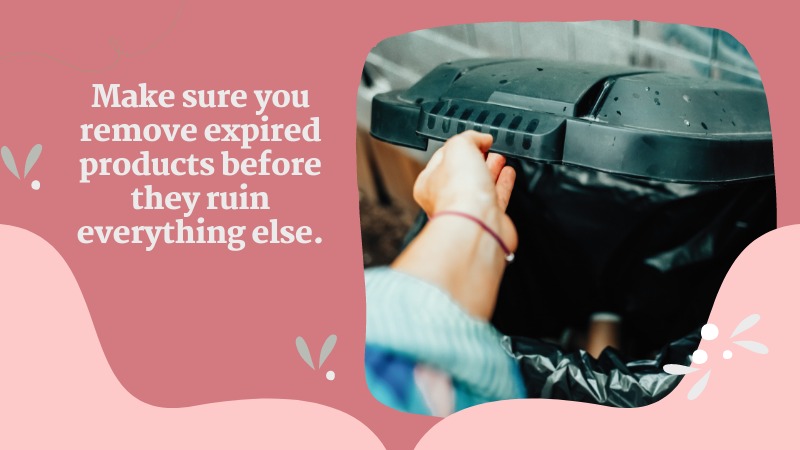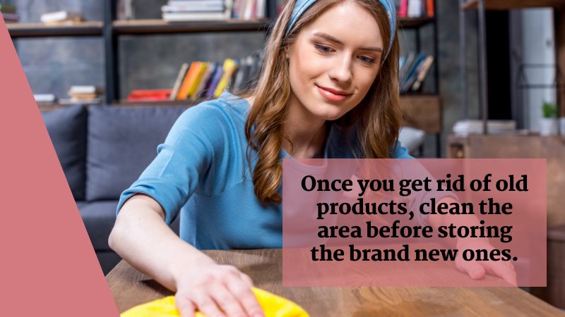 Keep an eye out for expired stuff, and once you get rid of old products, clean the area before storing the brand-new ones.