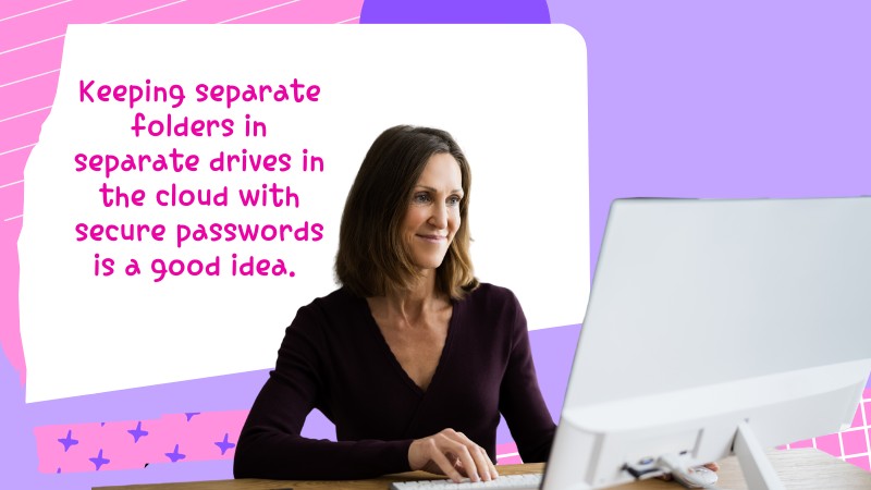 Keeping separate folders in separate drives in the cloud with secure passwords is a good idea.
