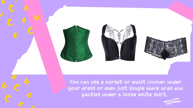 You can use a corset or waist cincher under your dress or even just simple black bras and panties under a loose white shirt.