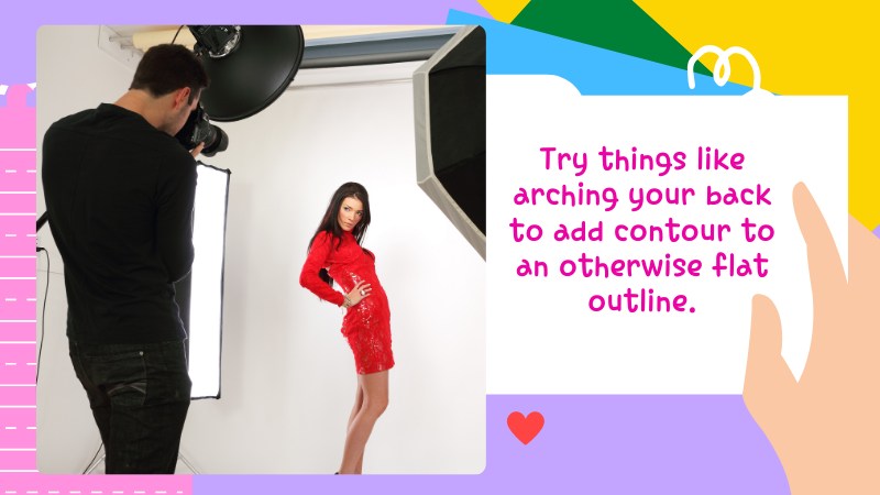 Try things like arching your back to add contour to an otherwise flat outline. Keeping your weight on a single foot and keeping a hip flared out will add the illusion of a more feminine lower body. If you put the camera above you and have it point down, you can highlight your face while hiding a little tummy or thin hips.