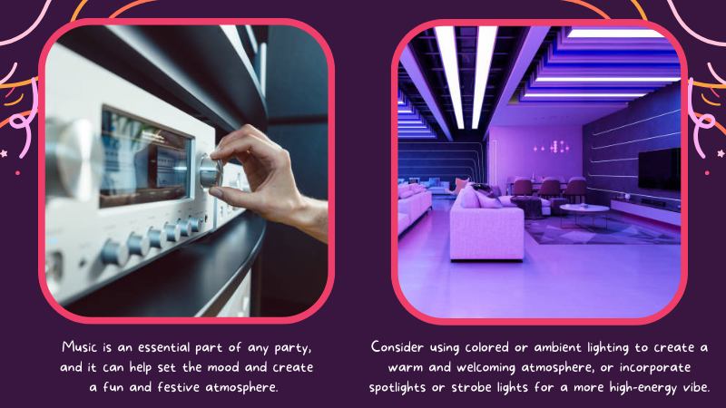 Lighting is another important factor that can make or break the mood of your party. Consider using colored or ambient lighting to create a warm and welcoming atmosphere, or incorporate spotlights or strobe lights for a more high-energy vibe. You could also use colored gels or filters to create different effects and moods throughout the evening.
