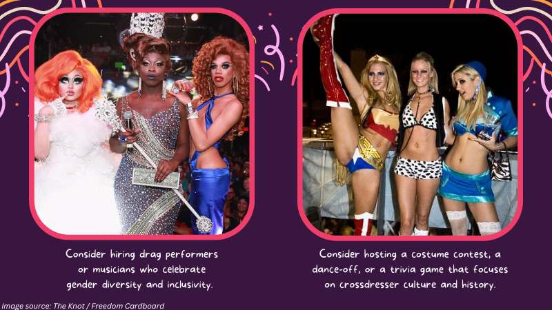 Consider hiring drag performers or musicians who celebrate gender diversity and inclusivity. You could also invite guests to perform their own lip-sync or drag routines, or host a fashion show to showcase everyone’s outfits.