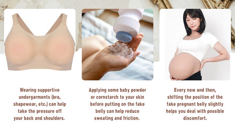 ● Every now and then, shifting the position of the fake pregnant belly slightly helps you deal with possible discomfort. Moving it a little higher or lower can relieve any pressure building up in one spot.