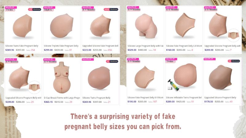 There’s a surprising variety of fake pregnant belly sizes you can pick from. Here’s my quick breakdown: