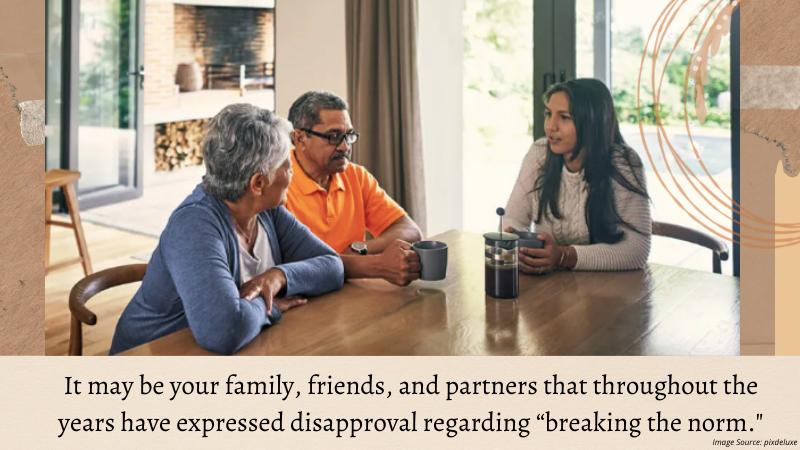 It may be your family, friends, and partners that throughout the years have expressed disapproval regarding “breaking the norm”. This is especially hard at a young age. When your activities and where you live aren’t your decisions. If you let this take a toll on you, you won’t be able to express something that makes you feel amazing to anybody. Your relationships won’t be honest with anyone and it is very unhealthy. Once we reach adulthood, we start making our decisions and we can decide to who we relate.