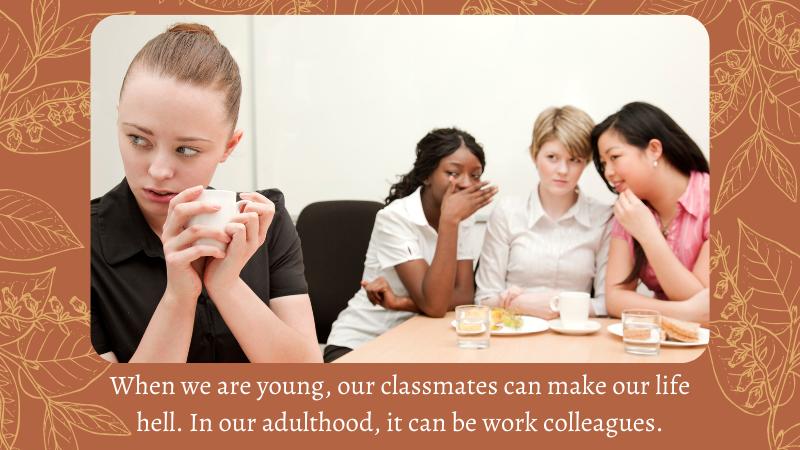 When we are young, our classmates can make our life hell. In our adulthood, it can be work colleagues. We can also experience some kind of boycott or persecution if we express ourselves without restrictions. In the first case, for all you teens that are clutched to a fixed school, talk to your parents. Be honest with them and how unhappy this makes you feel. But this stage passes and when we start working, it can be our colleagues that make life unbearable.