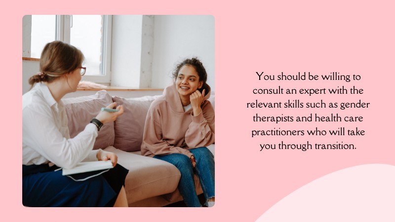 You should be willing to consult an expert with the relevant skills such as gender therapists and health care practitioners who will take you through transition.