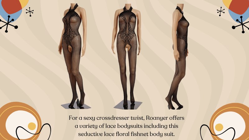 For a sexy crossdresser twist, Roanyer offers a variety of lace bodysuits including this seductive lace floral fishnet body suit.