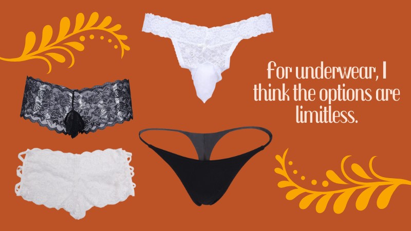 For underwear, I think the options are limitless. We are spoiled rotten with choices. To start with, you may still choose to wear what could be seen as traditional men’s underwear. However, nothing is stopping you from choosing briefs or men’s bikini-cut boxers, which will give you the feeling of being in panties while also giving you some freedom and air down there.